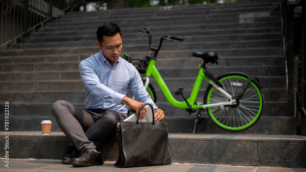 A determined Asian businessman sits on steps outdoors, organizing his laptop in his briefcase bag.