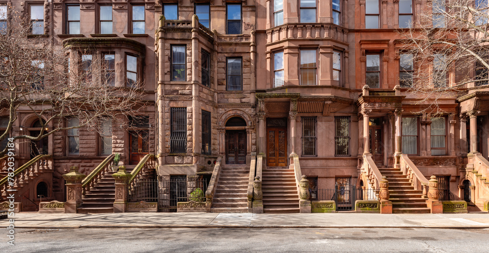 Panoramic view of Brownstones in Harlem. Rows of Townhouses. (Mount Morris Park Historic District). Manhattan, New York City