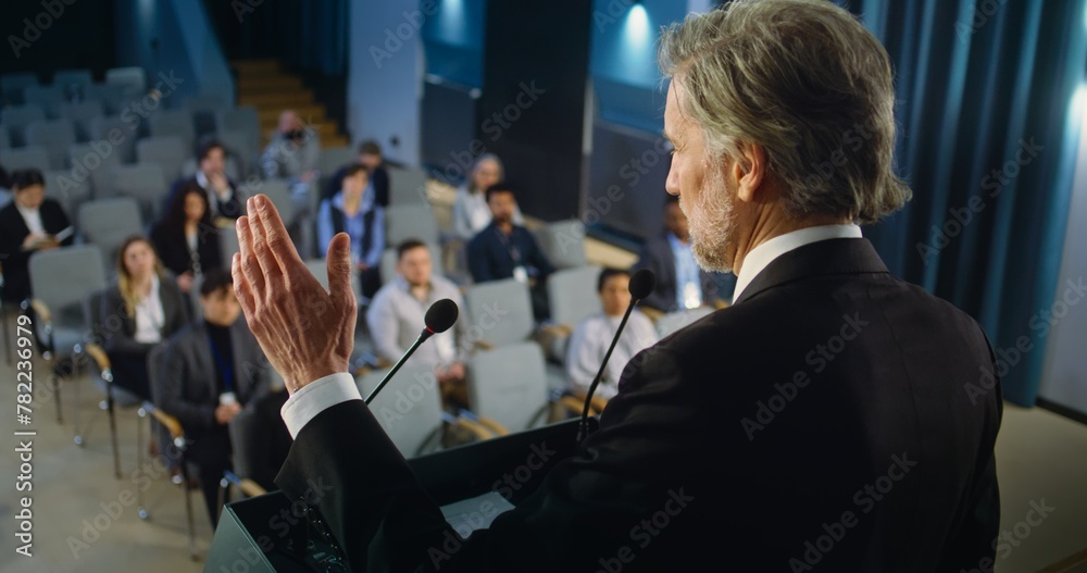 Back view of politician or activist pronouncing speech during press campaign in the conference hall. Mature organization representative answers questions, gives interview to journalists for media.