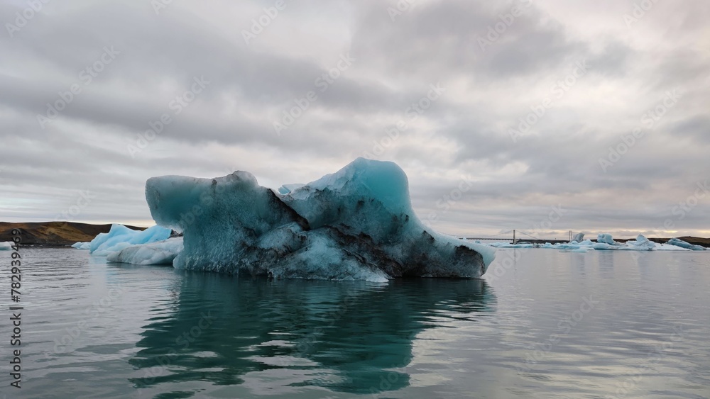 Floating icebergs in the water against a cloudy sky
