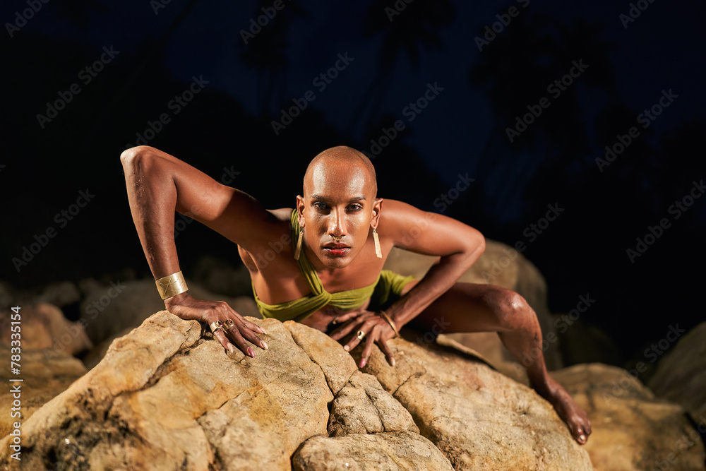 Androgynous black lgbtq fashion model creeps up like predator on stones in natural pool at night. Non-binary biethnic person poses in still water among rocks, wears custom jewelry, provocative dress.