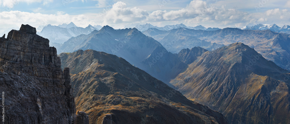 Kurz unter der Schlicker Seespitz tut sich ein herrlicher Blick über die herbstlichen Sellrainer und Stubaier Berge auf.