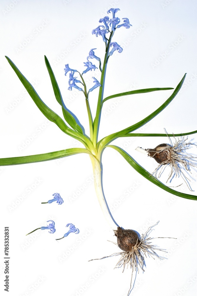 Herbarium. Hyacinth. The picture shows the flower stem, inflorescence, leaves and root system of the bulb.