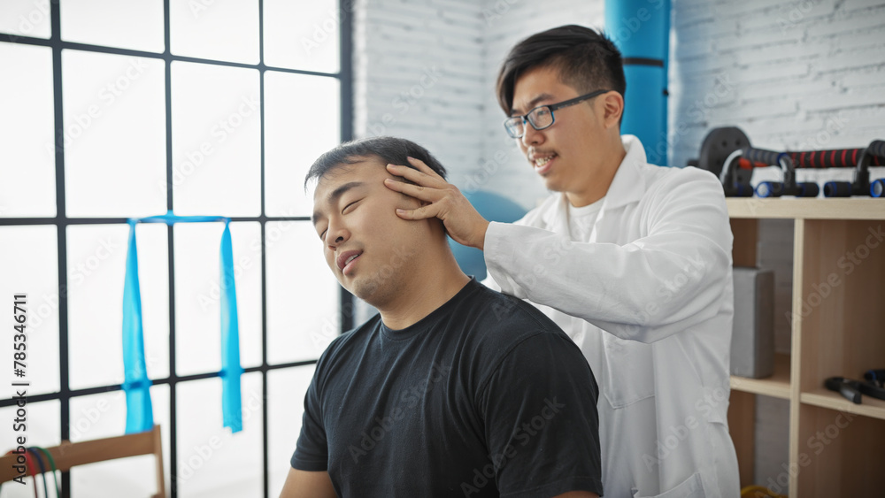 A male physiotherapist treating a patient's neck in a well-lit, modern physiotherapy clinic.