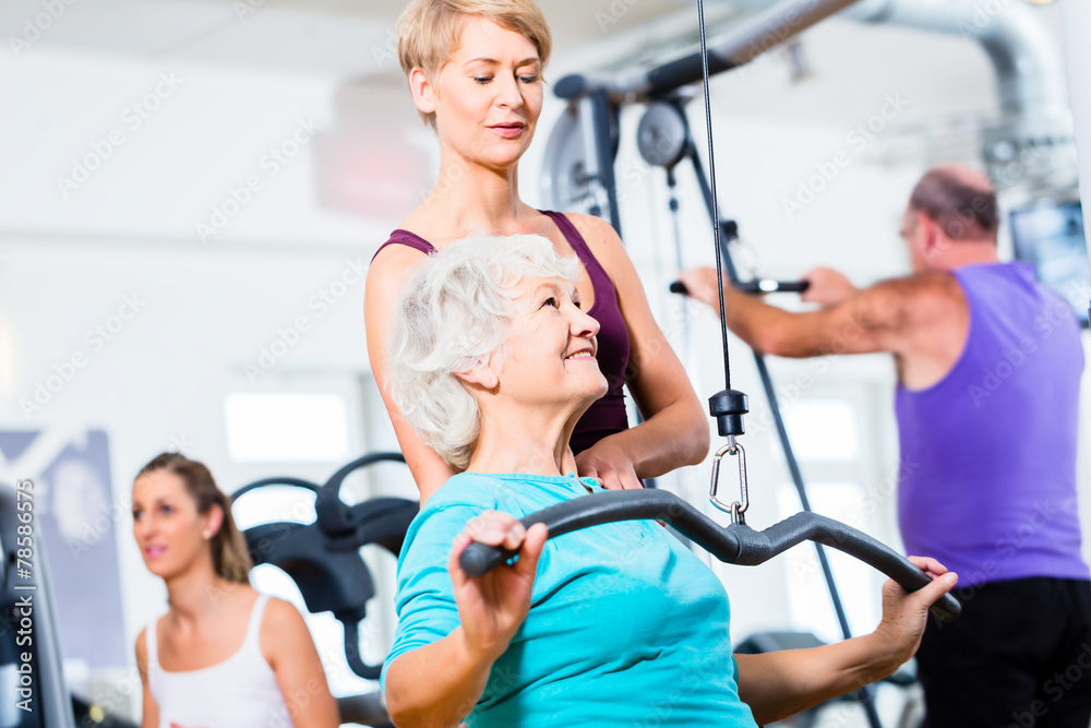 Seniorin beim Rückentraining mit Trainer im Fitness Sport