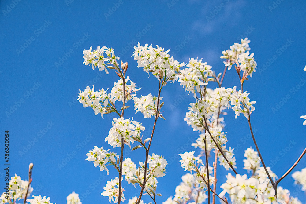 6月に果実を収穫できるジューンベリーの木に、春、満開の美しい花が咲く風景