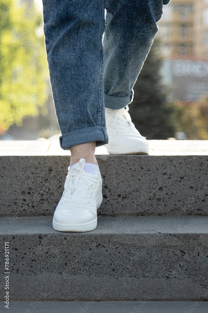 Female legs in white summer sneakers and rolled up jeans descending the stairs in the city . Front view , vertical shot