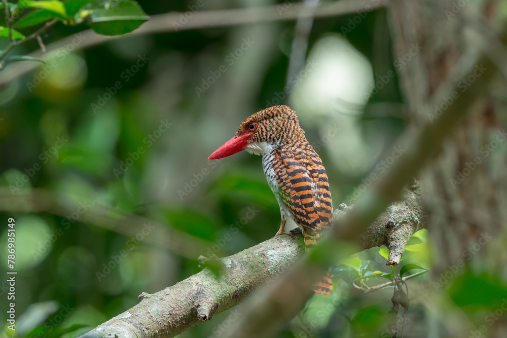 Banded Kingfisher The head, back, and tail have alternating brown stripes. The body below is white. The chest and sides of the body have a black scale pattern.