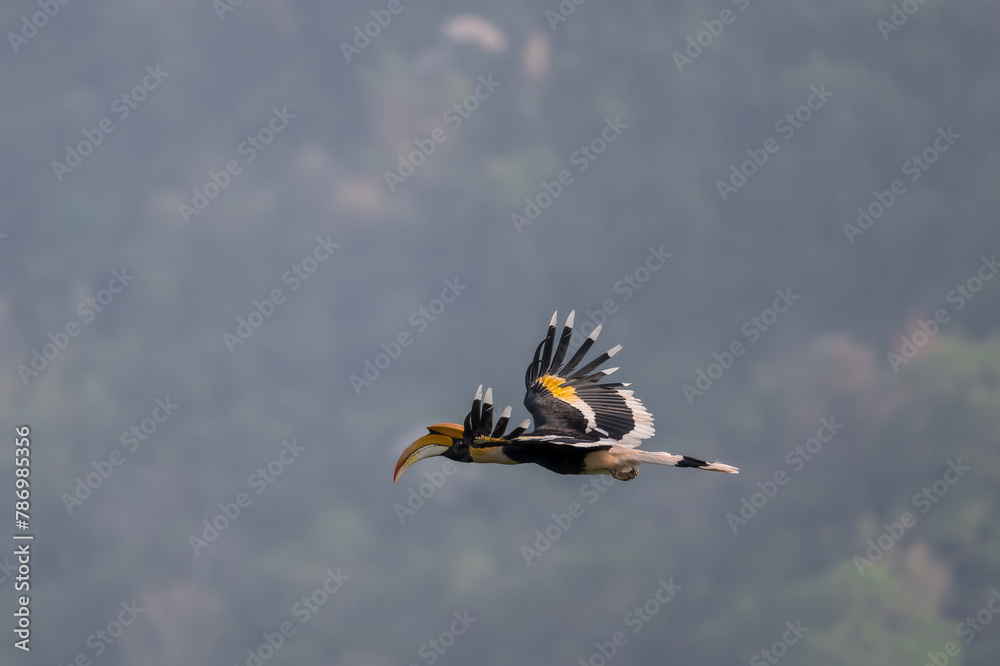 The bill and large hump are yellow. The face is black. The throat is white or yellowish-white. The body is black. The wings are black with a wide yellow stripe running down the middle of the wings.