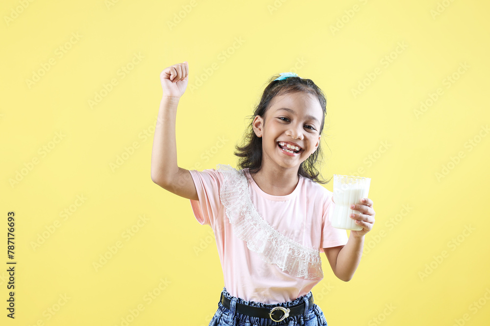 Asian Little Girl Kid Smile Holding Milk Glass and Show Power Strong Gesture