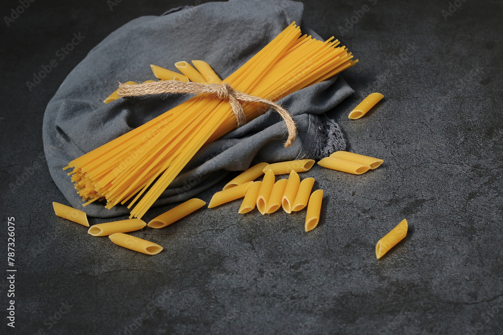 Spaghetti und Nudeln auf dunklem Schieferhintergrund.