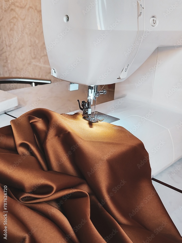 The image shows a close-up of a sewing machine stitching brown silk fabric. The image is well-lit, and the colors are vibrant. The sewing machine is white, and the fabric is a rich, chocolate brown.