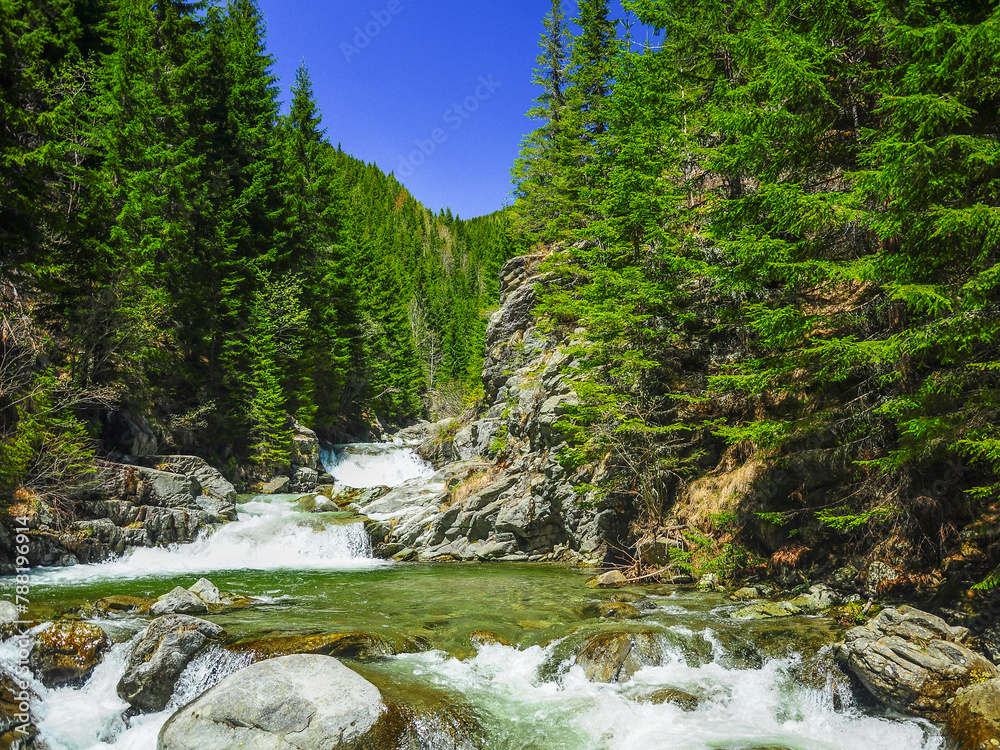 Refreshing landscape of a cold mountain river rapidly flowing through sharp rocks and forming waterfalls Coniferous forests grow along the rocky riverbed. Latorita Massif, Carpathia, Romania.