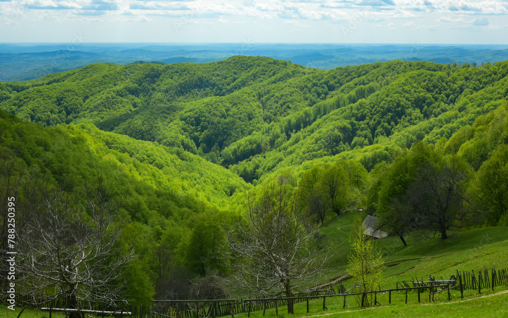 Bright green trees blooming on the hills of Buila Mountains. Rural orchards, wooden cottages and fences lay on the forested hillsides. Carpathia, Romania. Springtime greenery in the woods.