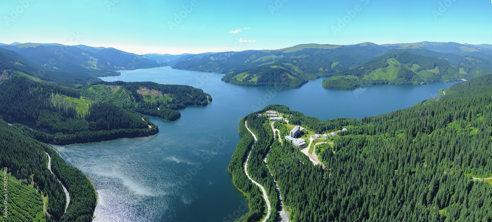 Aerial drone panorama above Vidra lake in a sunny day. The lake is surrounded by mountain crests covered with wild coniferous forests. A tourist resort lies at the lake's side. Carpathia, Romania.