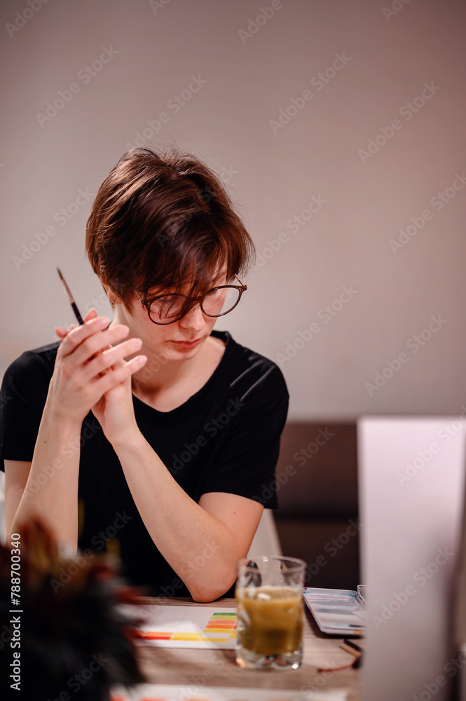 An artist pauses for reflection, brush in hand, as she contemplates her next stroke on a color chart, embodying the thoughtful nature of the creative process