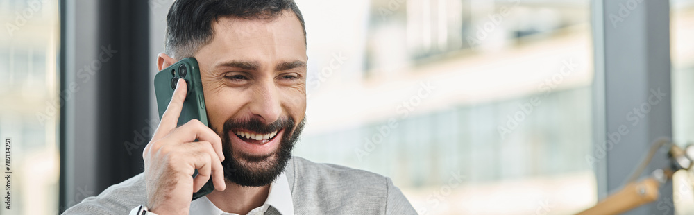 A man in a corporate setting holds a cell phone to his ear, engrossed in a business call while working on a project.