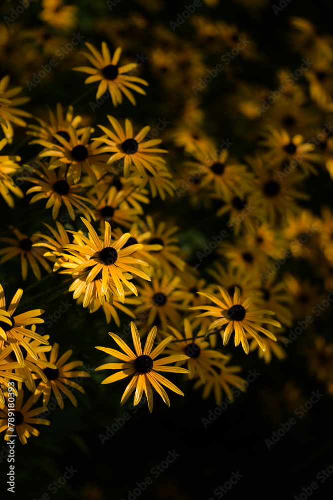 Yellow rudbeckia flowers on bokeh flowers background, black eyed susans, bokeh space for text, floral coneflowers background.