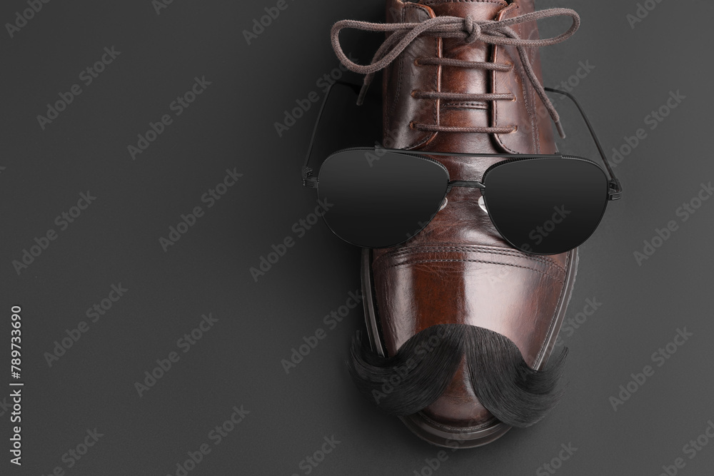 Artificial moustache, shoe and sunglasses on black background, top view. Space for text