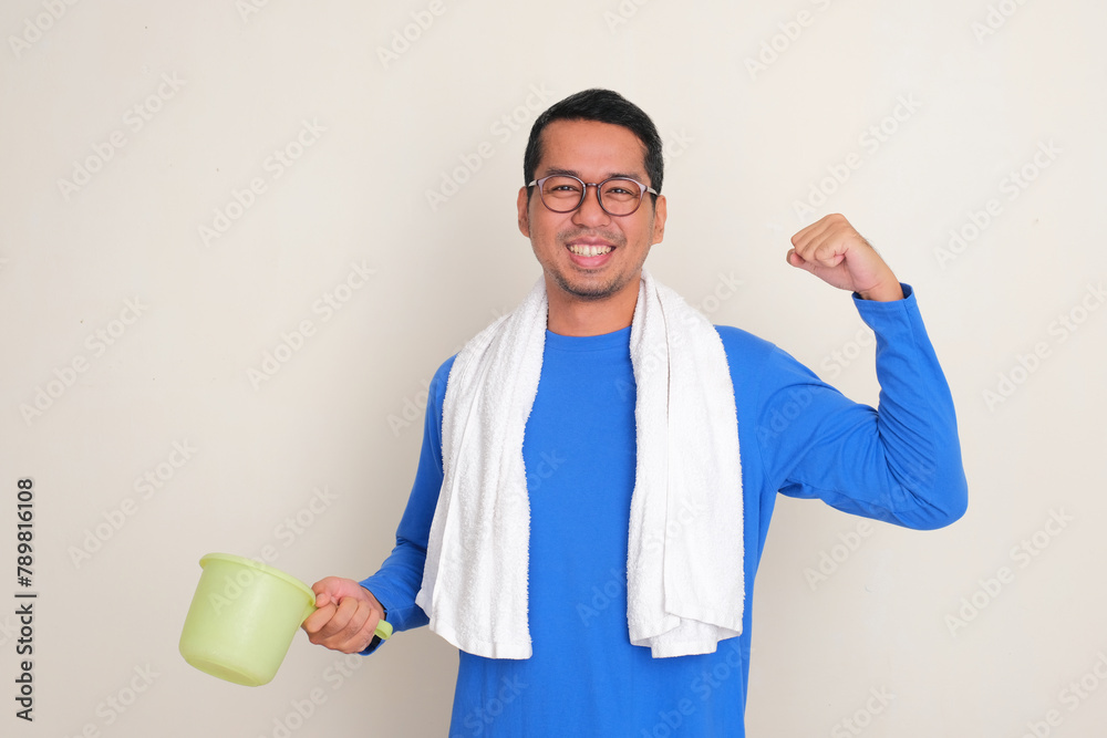 A man with towel on his neck and holding bath dipper showing his biceps muscle with happy expression