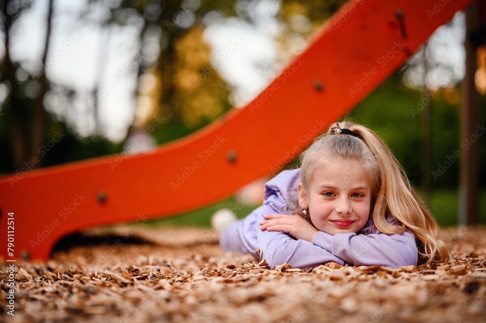 A young girl rests her head in her hands on the playground woodchips, her thoughtful gaze and the warm dusk light painting a picture of peaceful contemplation
