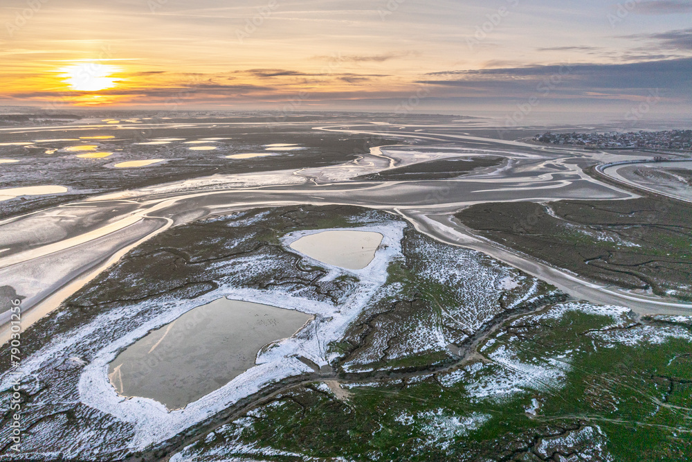 Vague de froid sur la Baie de Somme en hiver avec la neige en Picardie (Somme, Hauts-de-France, France)