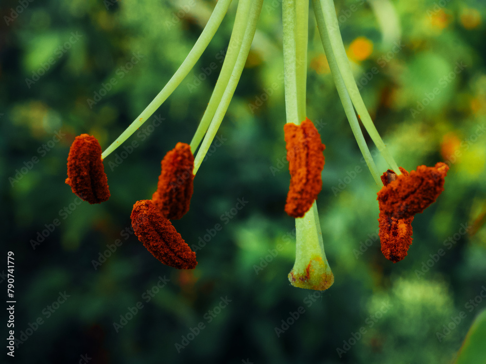 Vibrant orange pollen grains dangle from pale green filaments amidst a blurred verdant setting. Suitable for nature documentaries or garden websites.