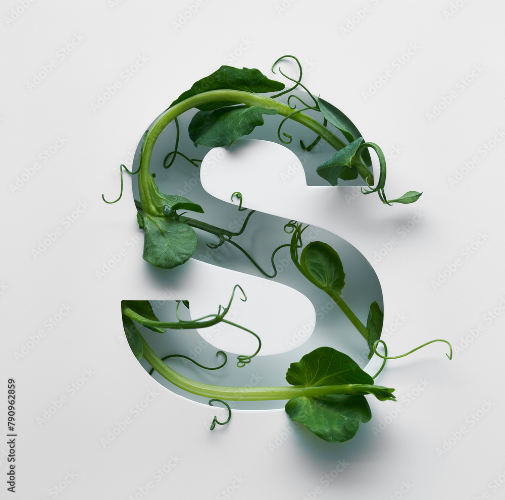 The capital letter S is decorated with a young green pea sprout on a white background.