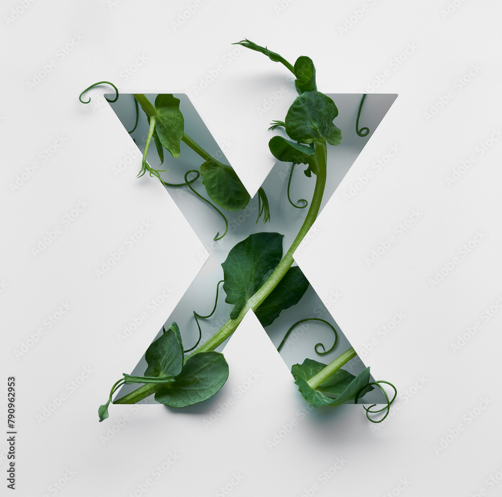 The capital letter X is decorated with a young green pea sprout on a white background.