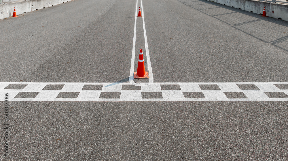 Aerial view abstract asphalt black Start and Finish grid line for race car in circuit texture background, Automobile and automotive background.