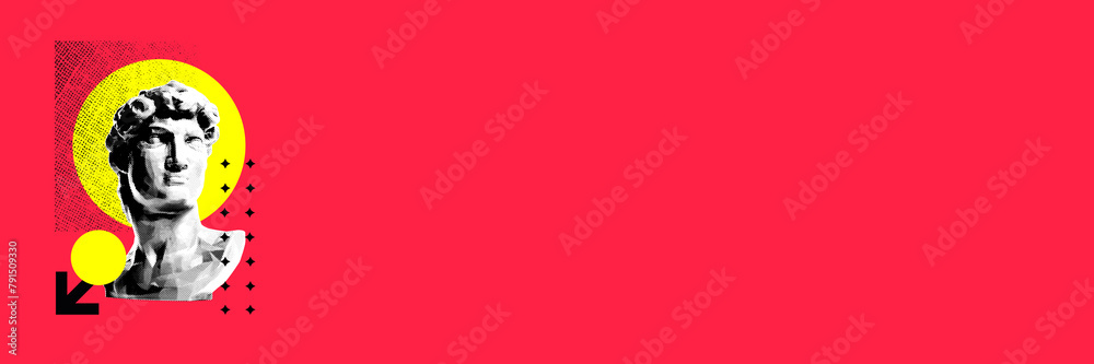 Banner. Classical sculpture with various geometric shapes against vibrant red background. Surreal style. Colorful splashes. Postmodernism. Concept of creativity, party, urban culture