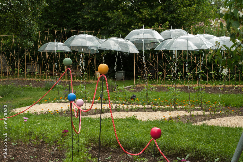 Potager, décorations de jardin, parapluie, jardin des six sens, Ecomusée du textile, Parc de Wesserling, Parc naturel régional du ballon des Vosges, Région Alsace, 68, Haut Rhin, France