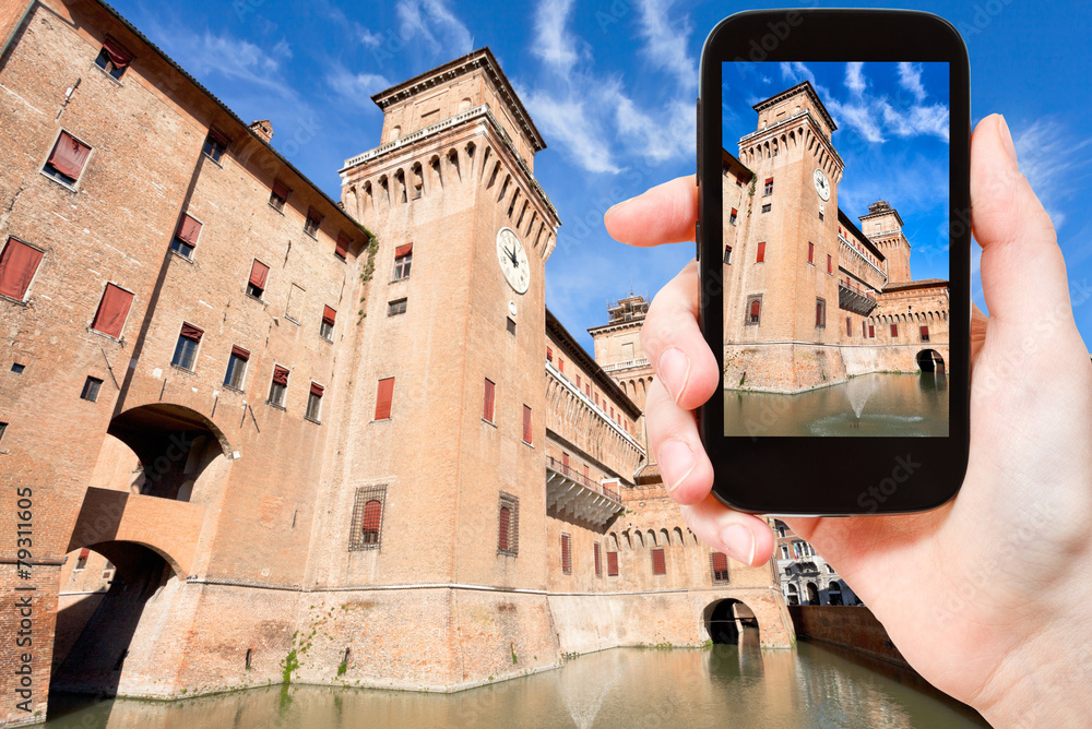 tourist taking photo of Castle Estense in Ferrara