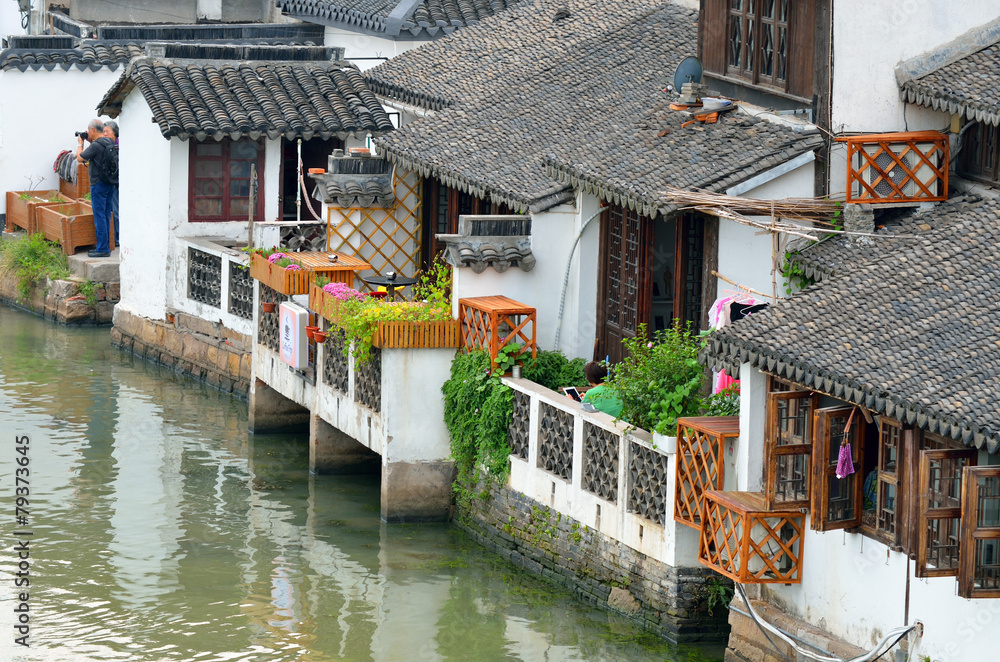 Old village by river in Shanghai with boat..