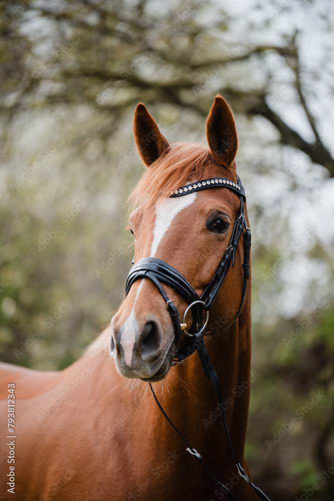 Wunderschöne Fuchsstute im Portrait, Pferdekopf mit Trense im Frühling mit gespitzten Ohren schaut aufmerksam