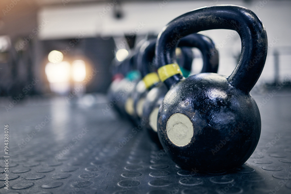 Exercise, kettlebell and weights on floor of gym for training, wellness or workout with space. Background, metal equipment in health club and fitness for action, physical improvement or strength
