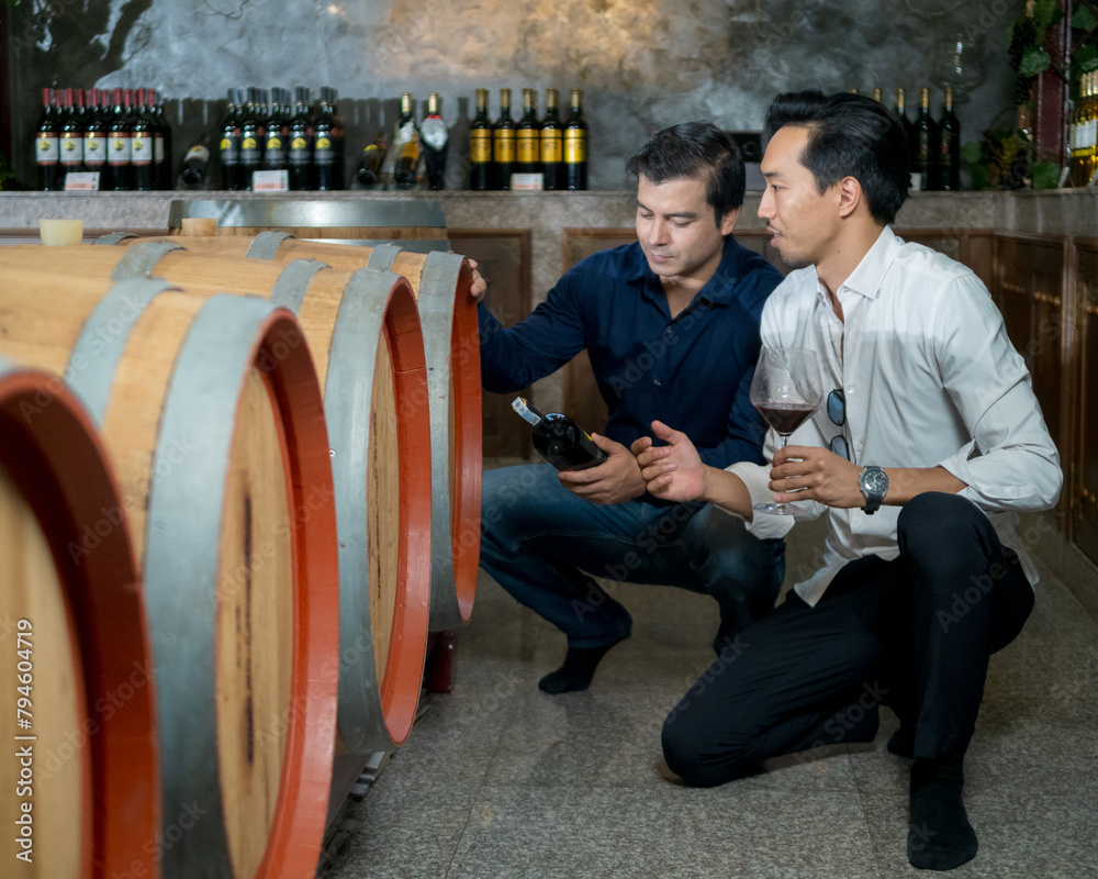 Portrait young boy friendship group man celebrating smile happy enjoying people bar hand holding drink taste dinner in glass wine and red wine bottle together with walk visit in wine factory beverage