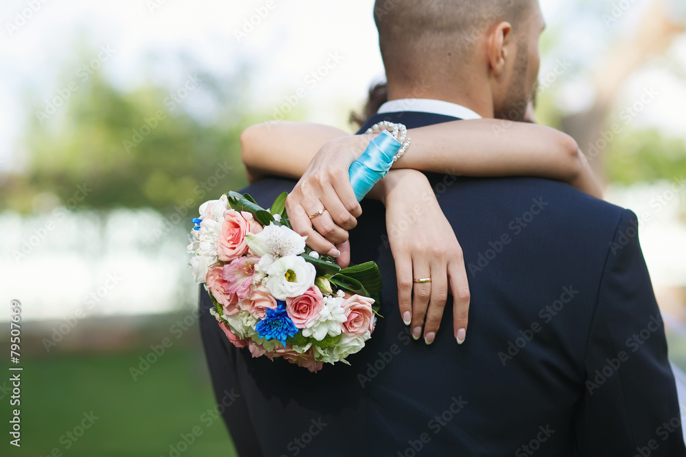 Bright colorful wedding bouquet in hands of the bride