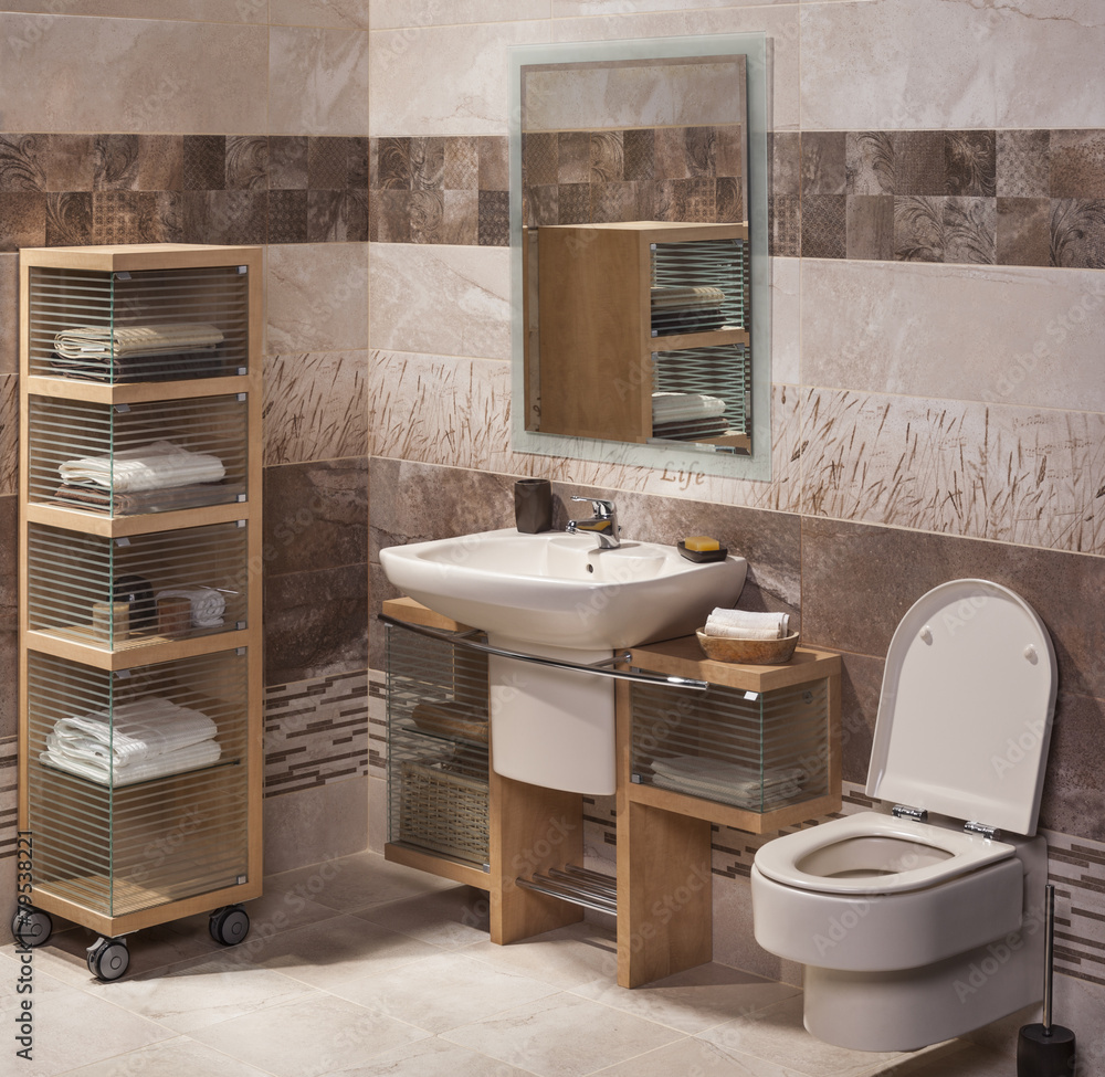 detail of a modern bathroom with sink, cabinet for towels and to