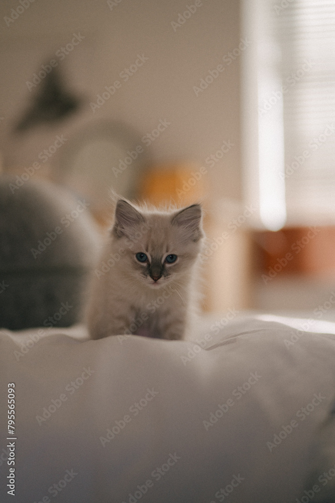 portrait of a fluffy white blue-eyed Ragdoll kitten on a bed