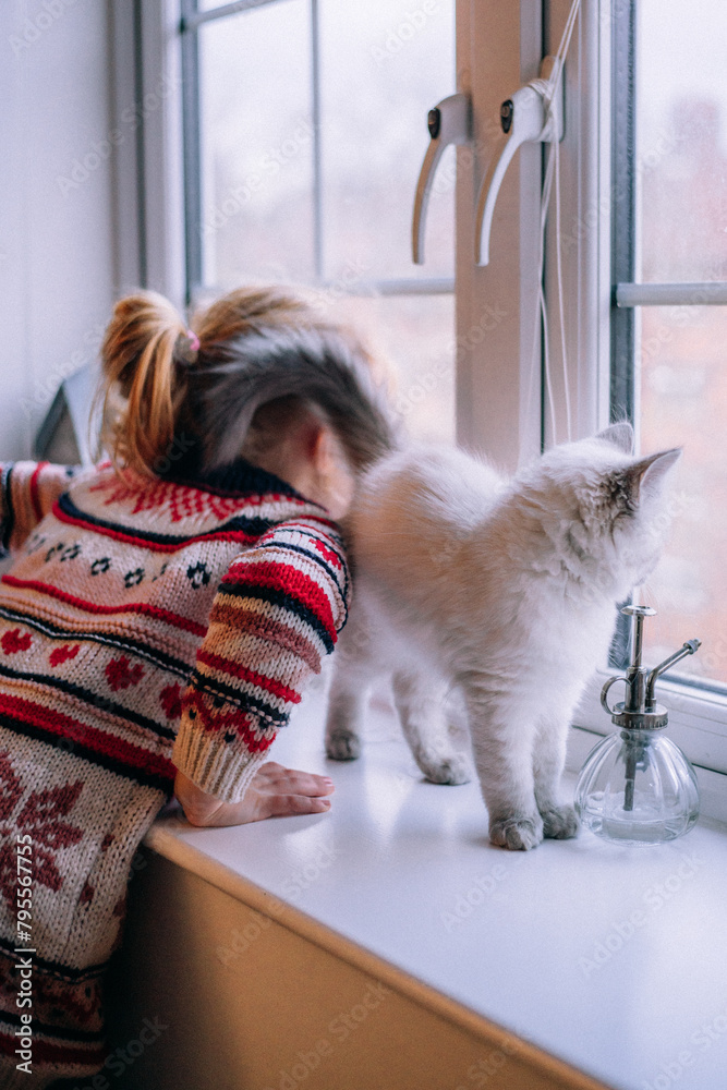 A girl in a warm knitted sweater and a fluffy white Ragdoll kitten look out the window together