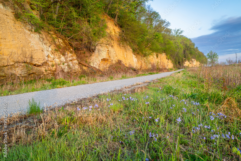 Steamboat Trace, bike trail converted from an abandoned railroad, near Peru, Nebraska, springtime morning scenery