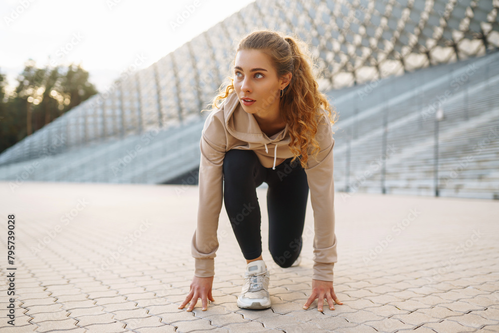 Young woman doing exercises outdoors in the morning. Sport, gym and healthy body concept.