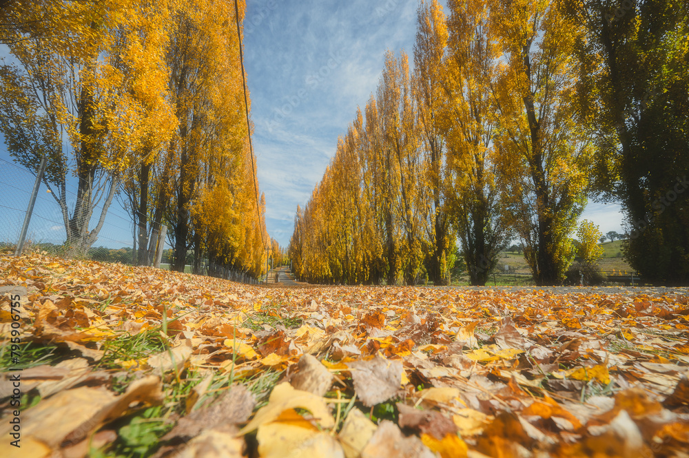 Blurred image of golden poplars in Autumn on both side of the road, Meadow Flat NSW Australia