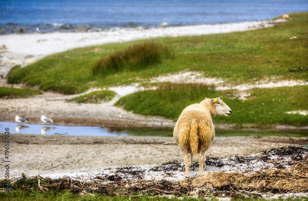 Sheep at the Famous and Beautiful Beach of Uttakleiv in Lofoten, Norway