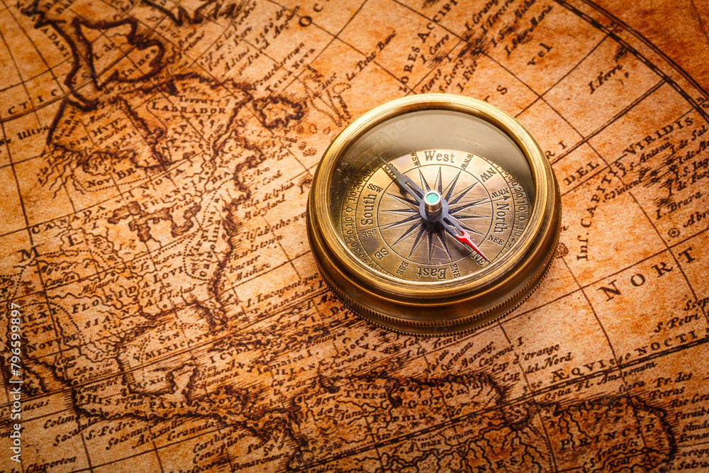 Vintage still life. Vintage compass lies on an ancient world map of 1565. Vintage style travel and adventure.