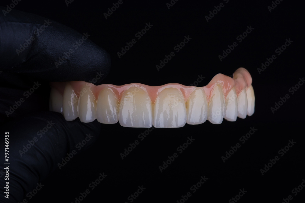 Two stages of making full dental zirkonium prosthesis on titanium bar. Raw before sintering and layered or painted zirkonium.