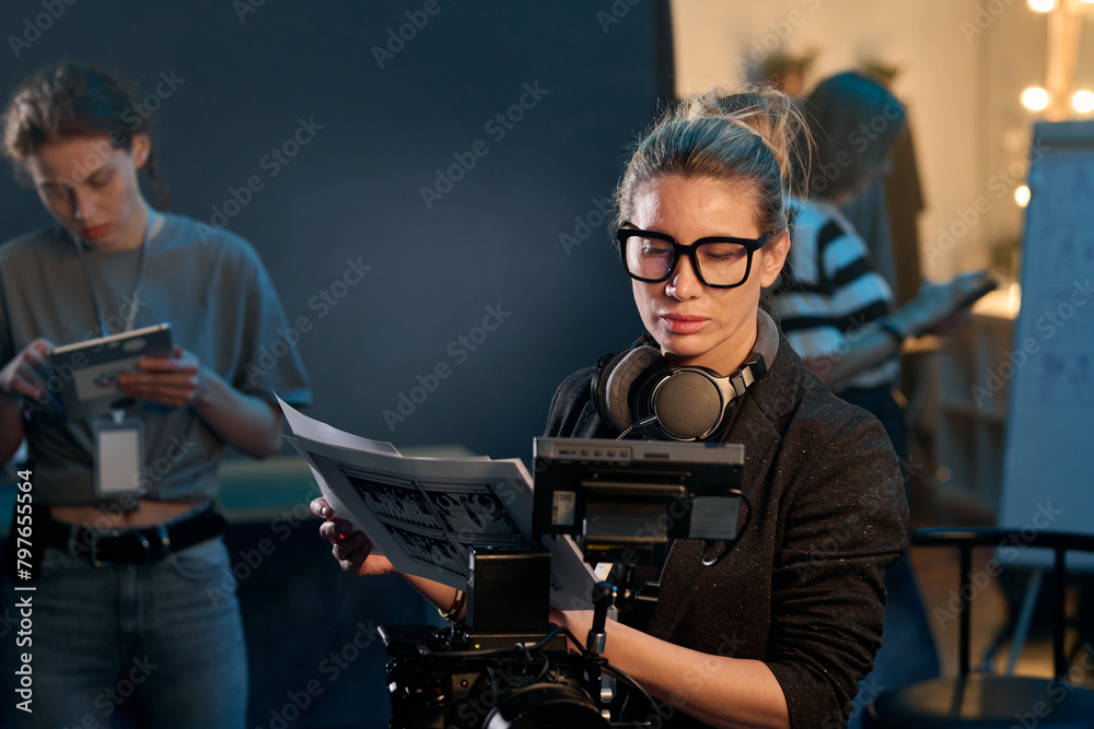 Waist up portrait of female director looking at camera screen while leading video production on set