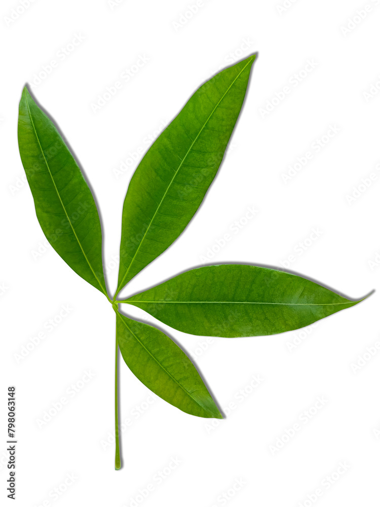 Makro von Ast und grünen Blättern mit Schlagschatten von Glückskastanie (Pachira Aquatica) Pflanze isoliert auf weiß. Natur Nahaufname vom Blatt der Pflanze Pachira ausgeschnitten mit Schatten.