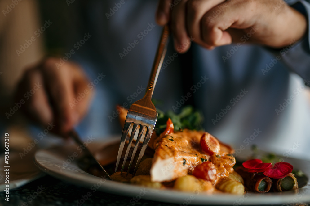 Close-up image of people's hands cutting a dish while they having lunch at a restaurant